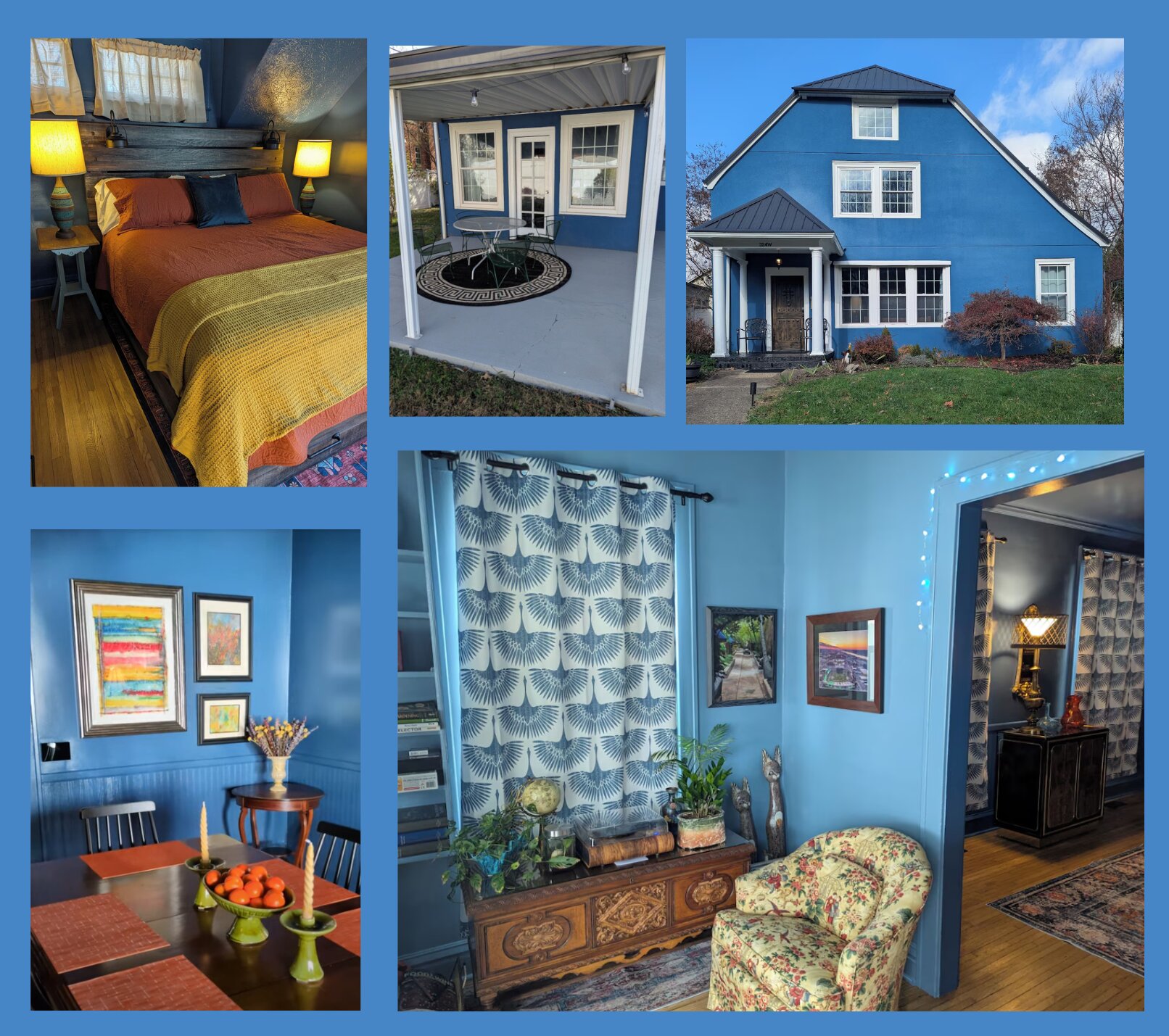 The Blue House is pet friendly, eclectic rental filled with local art, curated antiques, and a one-of-a-kind atmosphere, located steps from the nature/running trail that extends to both Ritter and Memorial parks.