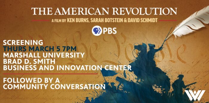 Join West Virginia Public Broadcasting for a public screening of selected excerpts from The American Revolution, the landmark documentary series by Ken Burns, Sarah Botstein, and David Schmidt, followed by a community conversation at 7 p.m. on Thursday, March 5, 2026, at the Brad D. Smith Business and Innovation Center on the campus of Marshall University.