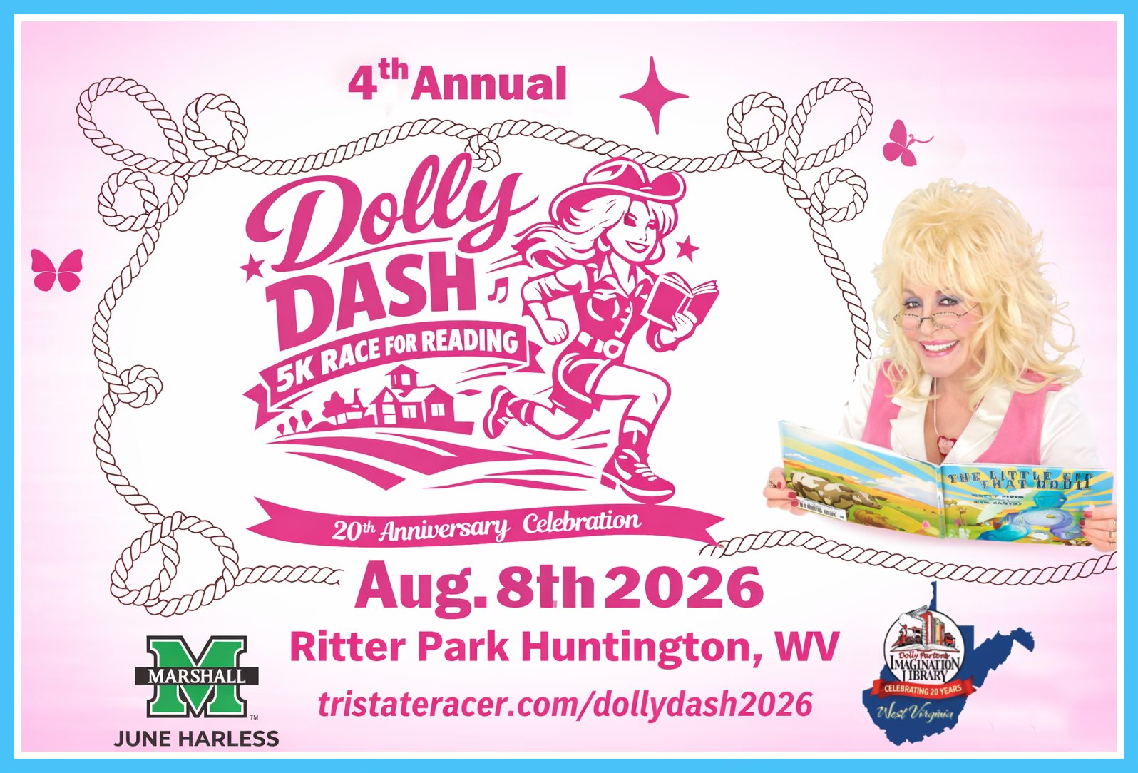 Celebrate 20 Years of Dolly Parton’s Imagination Library in West Virginia with us at the 4th Annual Dolly Dash 5K Race For Reading in Ritter Park, Huntington on Saturday, August 8th @9:25AM!