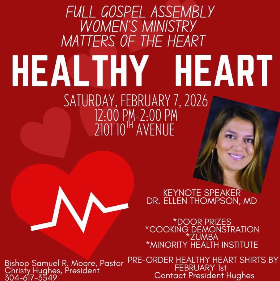 The “Matters of the Heart” Healthy Heart Event sponsored by the Full Gospel Assembly Women’s Ministry, 2101 Tenth Avenue, Huntington, WV will be held on Saturday, February 7th 12:00 Noon. – 2:00 P.M. in the Cora C. Duckworth Fellowship Hall of the church. Please join us for an afternoon of education by local cardiologist, Dr. Ellen Thompson, a cooking demonstration by Timbalena Mathis, R.N, and Zumba lesson taught by certified instructors Tosha Hairston and Erica Harmon. The Marshall University Minority Health Institute will provide blood pressure checks and swag bags. Attendees will also enjoy a sampling of heart healthy treats and the opportunity to win great door prizes. Matters of the Heart Healthy Heart Event T-Shirts may be ordered by Sunday, February 1st. Women (and supporters) are asked to wear red on in celebration of Go Red for Women in the Sunday 10:30 a.m. service. For more information, please contact Sis. Christy Hughes, Women’s Ministry President at 304-617-3549; Bishop Samuel R. Moore, Pastor.