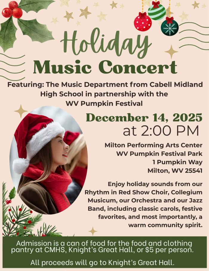 Come out to Pumpkin Park and enjoy music from Cabell Midland High School’s Rhythm in Red Show Choir, Collegium Musicum, Orchestra and Jazz band, including classic carols, festive favorites, and most importantly, a warm community spirit.
