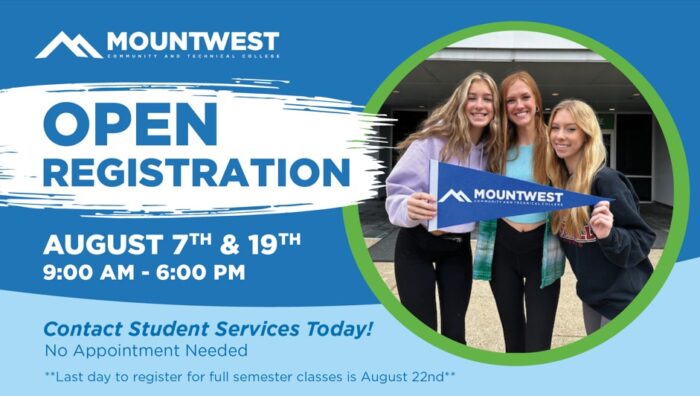 Mountwest is hosting an Open Registration event on August 19th. This is a great opportunity to get those last minute registrations and ensure you have everything ready to go prior to the start of the fall semester. No appointment required. For more informaton, contact Student Services at 304-710-3472 or email admissions@mctc.edu. The last day to register for a full semester course is August 22nd. Fall semster starts August 25th!