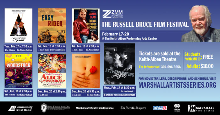 Russell Bruce and his wife Sandra were special friends of the Marshall Artists Series (MAS). They came to know the MAS by traveling from Chicago to Huntington to see Glen Campbell in concert. (Russ was a big fan) & Glen was only playing a select group of cities). The Bruce’s were in awe of the programs offered through the MAS in a market the size of Huntington. The MAS was touched when the Bruce family decided to share Russ’s love of film with our patrons this season. Russ’s love of art, people, and all having access to education will be celebrated as we take our first journey “down the rabbit hole” with some of his favorites!