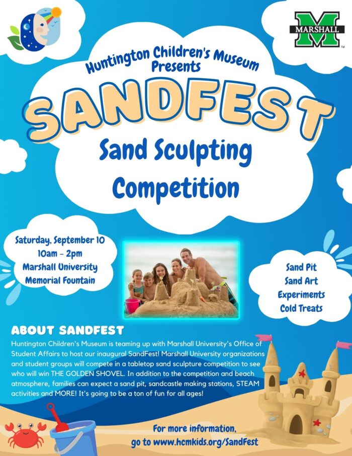 Looking for some fun in the sand and sun, but can’t make it to the beach? Huntington Children’s Museum and Marshall University’s Office of Student Affairs is teaming up to bring the beach to you! Plan to join us at our inaugural SandFest on Saturday, September 10 from 10 am to 2 pm at the Memorial Fountain behind the MU Student Center. Marshall student groups will compete in a tabletop sand sculpture competition to see who will win the inaugural Golden Shovel award. In addition to the sand sculpture competition, families can expect a sand pit, sandcastle making stations, STEAM activities and more! This event is free and designed to be fun for all ages!