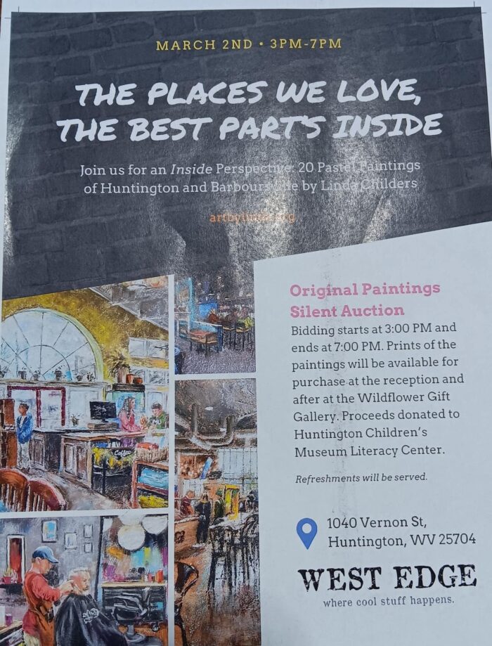 Be sure to add Art by Linda’s “The Places We Love, The Best Parts Inside” reception on March 2, 2024 from 3 pm-7 pm at West Edge Factory to your calendar. We’re grateful the proceeds will benefit Huntington Children’s Museum! Bidding starts at 3pm. Prints will be available for sale at the reception and at the Wildflower Gallery.