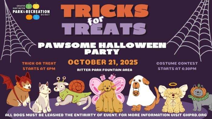 Get your furry friends ready for a tail-wagging good time at our Trick for Treats: Pawsome Halloween Party! Hosted by the Greater Huntington Park & Recreation District, this spook-tacular event invites dogs and their humans for an evening of treats, fun, and festive cheer.