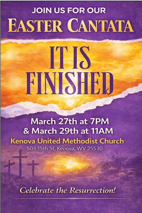 The Kenova United Methodist Church Chancel Choir and Praise Band will present "It is Finished" Easter Canata on Friday, March 27, 2026 @ 7:00 pm. The cantata is under the... View Article