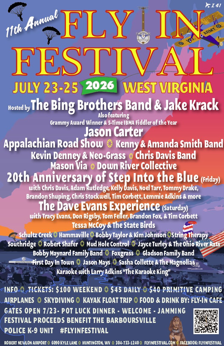 We are EXCITED to announce the initial artist lineup for the 11th Annual Fly In Festival , JULY 23-25, 2026 at the Robert Newlon Airpark (I-41) in Huntington, WV.More exciting announcements will be... View Article